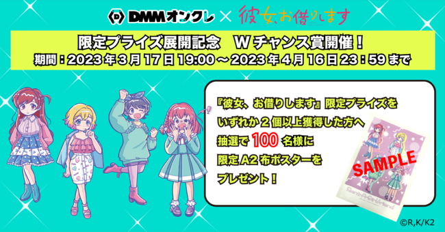 Wチャンス賞開催期間中に『彼女、お借りします』のオリジナル限定プライズをいずれか2個以上獲得した方から抽選で100名様に、限定A2サイズ布ポスターをプレゼントいたします。