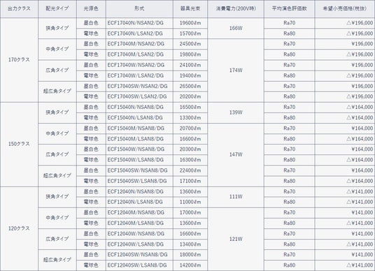 3つの明るさ(170クラス・150クラス・120クラス)に、4つの配光(狭角・中角・広角・超広角)、2つの光源色(昼白色・電球色)、2つの本体色(ダークグレイ・ホワイト)をラインアップ。