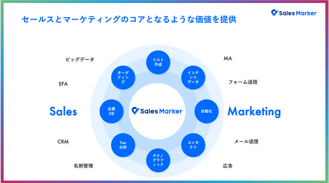 当社は、BtoB向けセールスインテリジェンス『Sales Marker』の開発・提供を行っています。『Sales Marker』は、約500万件の企業データベースとインテント(興味関心)データとを組み合わせる事により、今ニーズが顕在化している企業を見つけ、マルチチャネルで多角的なアプローチを行う事ができる、新時代の営業インテントセールスを国内で初めて実現し、多くの企業の成長に貢献してきました。
