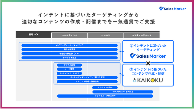 そこでこれらの課題を解決するため、インテント(興味関心)の高まった企業に絞った戦略的なセールス・マーケティングが実現できる『Sales Marker』と、その戦略をよりプロフェッショナルに遂行できる専用マーケターを多数抱える『KAIKOKU』との業務提携に至りました。