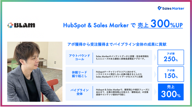 今回の業務提携に先駆けて、『KAIKOKU』を提供するBLAM社は、『Sales Marker』を活用したこの一連のオペレーションを自社内で実践し、売上300%アップなど目覚ましい成果をあげています。