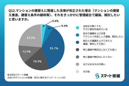 また、「マンションの建替えに関連した法律が改正された場合(マンションの建替え推進、建替え条件の緩和等)、それをきっかけに管理組合で議論、検討したいと思いますか。」との質問に対しては、「自分で課題を上げる等アクションを起こして議論、検討したい」「他の人が議題を上げてきたら議論、検討しても良い」と回答した人が約4割という結果になりました。これにより、法改正が建替えを進めるために一定の効果があることがわかります。