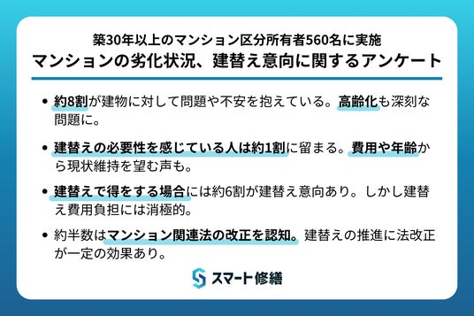 こうした背景のもと、スマート修繕では、築30年以上のマンション居住者に対して法改正の認知、建替え意向、お住いの建物の劣化状況に関するアンケート調査を実施しました。