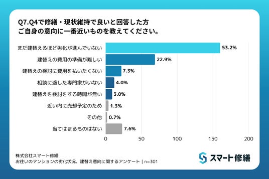 現在、建替えの必要性を感じず、修繕や現状維持で良いと考えている方に対して「ご自身の意向に一番近いものを教えてください」と質問したところ、半数以上の方が「まだ建て替えるほど劣化が進んでいない」と回答しました。一方で、約3割の方は「建替えの費用の準備が難しい」、「建替えの検討に費用を払いたくない」と回答しており、現状の建物の状態に加え、費用面での懸念から修繕や現状維持を選択している方も多いことが分かりました。