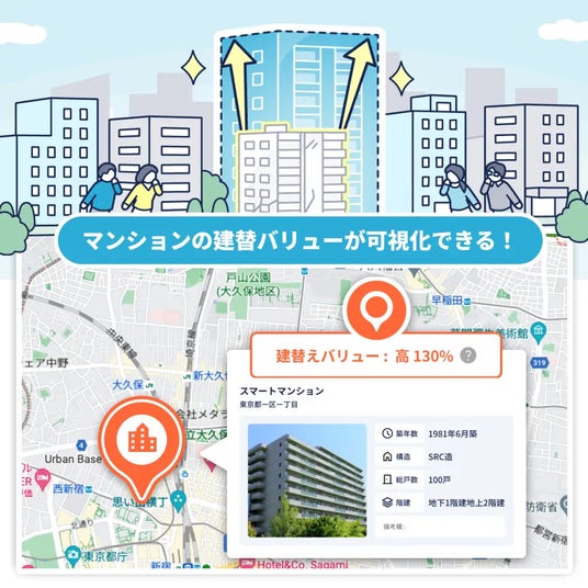 マンションやビルなど大型建物の大規模修繕など共用部工事の見積、工事支援サービス「スマート修繕」のほか、マンションの建替バリューを見える化する「スマート建替(ベータ版)」、大型建物の修繕工事の見積金額の査定を行う「スマート修繕顧問」、管理組合向けの金融商品の共同開発等、建物再生領域における事業を展開しています。専門知識のないマンション管理組合や不動産オーナーなどが、業界の事情に左右されることなく、フェアに取引できることを目指しています。