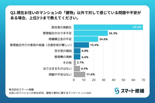 「現在お住いのマンションの『建物』以外で対して感じている問題や不安がある場合、上位3つまで教えてください。」という質問に対しては、約7割の人が「居住者の高齢化」に課題を感じていると回答しました。続いて、「管理組合のなり手不足」(34.3%)、「修繕積立金の不足」(24.6%)が課題と感じられています。