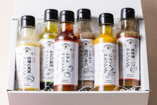 素材の美味しさを感じられるドレッシング。四種の果実・わさび醤油・トマト・くるみと焙煎ごま・にんじん・梅味噌の6種類の味わいです。セットにしてギフトにもおすすめです。