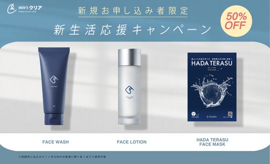 新生活応援キャンペーンメンズクリアで新規お申し込みされた方限定で、各商品が50%OFFで購入が可能。