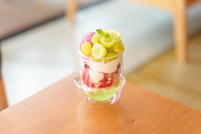 シャインマスカットを贅沢に使い、自家製マスカットゼリーに濃厚なぶどうの風味が香るキャンベルアイスクリームをトッピングしました。爽やかなベリーソースやサワーヨーグルトアイス、マスカルポーネクリームなど、まだまだ暑い9月にも嬉しいシャインマスカットと爽やかな素材の組み合わせをお楽しみください。
