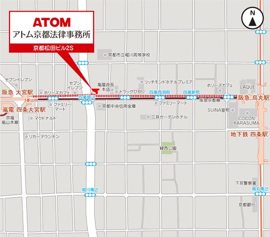 アトム京都法律事務所は、2025年1月7日に開業。京都市内の中心である四条堀川にあります。