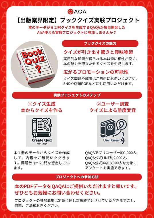 書籍のPDFデータをQAQAにご提供いただくだけで、簡単にクイズを作成することができます。詳細は下記応募フォームよりお問合せください。