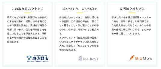 講座の運営には、レンタルオフィス「Re:ZONE」を展開する株式会社K-FIRST(ケーファースト)と、在宅ワーク支援に豊富な実績を持つBizMow株式会社(ビズモウ)が連携。