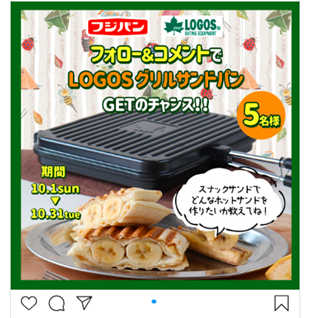 また、23年10月1日~31日の1ヶ月間、『LOGOSグリルサンドパンが当たるキャンペーン』を実施いたします。フジパン公式Instagramをフォロー&コメントすることで、抽選で5名様に『LOGOSグリルサンドパン』が当たります。商品の裏面にあるキャンペーン告知欄からでもご確認いただけます。