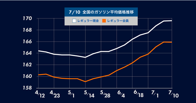 7月10日(月) 時点のレギュラーガソリンの全国平均は、169.6円となり先週から1.5円の値上がり。8週連続の値上がりとなりました。