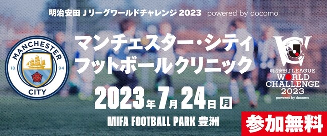 株式会社NTTドコモ(以下、ドコモ)は、「明治安田Jリーグワールドチャレンジ2023 powered by docomo」を 共同開催する公益社団法人日本プロサッカーリーグ(Jリーグ)と共に、スポーツを通じた子どもの成長機会を提供する場 として、「明治安田Jリーグワールドチャレンジ2023 powered by docomoマンチェスター・シティ フットボールクリニック」(以下、本イベント)を2023年7月24日(月)にMIFA Football Park 豊洲で開催いたします。本イベントは、 マンチェスター・シティFCのコミュニティコーチ※1が講師となって直接子どもたちへ指導します。当日はマンチェスター・シティFCのレジェンドOBも参加予定です。
