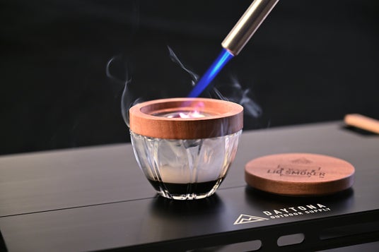 燻製料理と聞くとハードルが高い印象がありますが、LiQスモーカーはグラスやカップに乗せてスモークチップを乗せてターボライターで炙るだけ。スタイリッシュでお手軽簡単なスモーカーです。