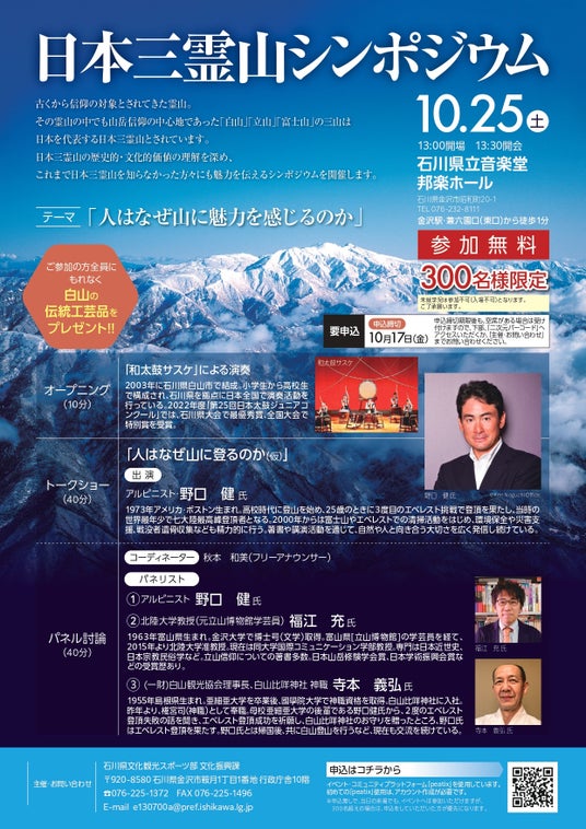 古くから信仰の対象とされてきた霊山の中でも山岳信仰の中心地であった「白山」「立山」「富士山」は、日本を代表する日本三霊山とされています。日本三霊山の歴史的・文化的価値の理解を深め、これまで日本三霊山を知らなかった方々にも魅力を伝えるため、「人はなぜ山に魅力を感じるのか」をテーマとしたシンポジウムを開催します。