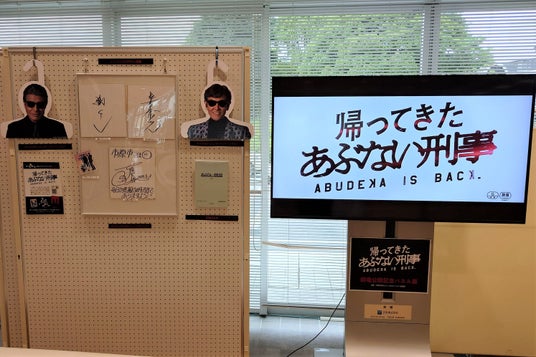 舘ひろしさんと柴田恭兵さん、土屋太鳳さんのサイン色紙や、映画オリジナルグッズなどを展示しています。