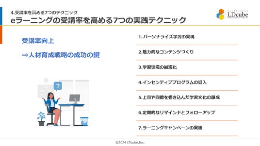 研修のスタイルにとらわれない企業向け人材育成サービスを提供する株式会社LDcube(本社:東京都千代田区、代表取締役社長:新井澄人、以下「当社」)は、「【チェックリスト付】eラーニングの落とし穴と、受講率を向上させ学習効果を最大化する方法を徹底解説!」と題してウェビナーを開催しますので、お知らせします。
