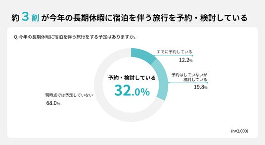 2026年の長期休暇における宿泊を伴う旅行について、全国の男女2,000名を対象に調査を実施したところ、長期休暇(またはそれに代替する休み)の旅行を「すでに予約している」と回答した人は12.2%、「予約はしていないが検討している」と回答した人は19.8%となり、旅行を予定・検討している層は合計で32.0%となりました。