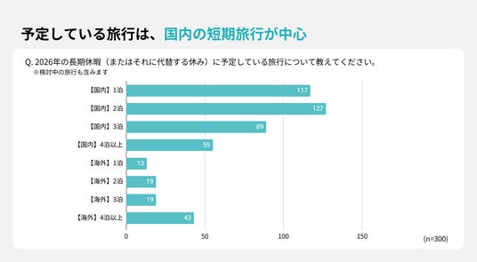 ・2026年、約7割が長期旅行をまだ検討していないと回答。検討している人の中でも短期・少予算の「国内1~2泊」が中心
