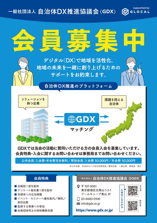 一般社団法人自治体DX推進協議会(GDX)は、自治体のデジタルトランスフォーメーションを推進し、地域社会の持続可能な発展を目指す団体です。各自治体と協働しながら、デジタル技術を活用した地域課題の解決やイノベーション創出を支援しています。地方自治体と事業者の架け橋となり、デジタルトランスフォーメーションを通じて地方創生を加速するパートナーシップの場を提供します。お気軽にお問合せください。