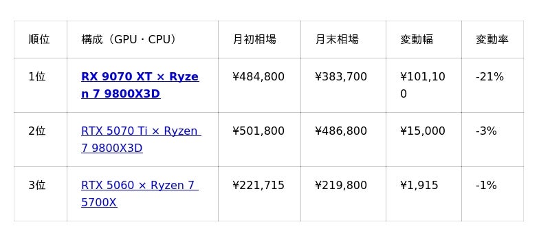エントリー~ミドル帯の中でも価格が安定している構成であり、引き続きコストパフォーマンスを重視するユーザーから支持を集めていることがうかがえます。