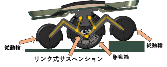 ●「リンク式サスペンション」はサービスロボット向けプラットフォームの重要な構成要素、整備されてない路面での安定走行に貢献。