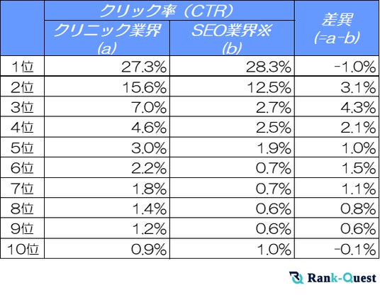 さらに、ランクエストサイト(SEO業界)におけるクリック率データとも比較し、クリニックサイトならではのクリック傾向を検証しました。