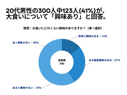 20代男性の300人を対象とした「大食いにどれくらい興味がありますか?」というアンケートで123人(41%)が「大食いについて興味あり」という結果になりました。