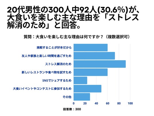20代男性の300人を対象とした「大食いを楽しむ主な理由は何ですか?」というアンケートで92人(30.6%)が「ストレス解消のため」という結果になりました。