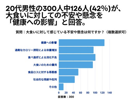 20代男性の300人を対象とした「大食いに対して感じている不安や懸念は何ですか?」というアンケートで126人(42%)が「健康への影響」という結果になりました。