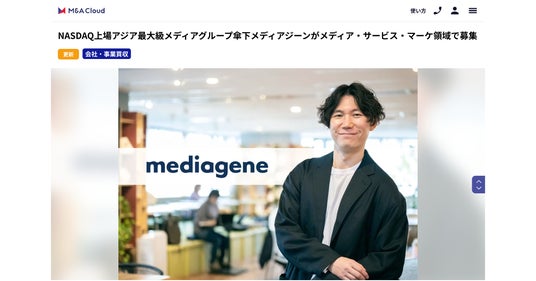 TNLメディアジーン(NASDAQ: TNMG)のグループ会社である株式会社メディアジーンは、オンラインM&Aマッチングプラットフォーム「M&Aクラウド」にて、当社のM&A戦略や買収対象企業の要件に関する情報(https://macloud.jp/offers/6157)を公開しました。事業拡大の一環として、メディアや動画領域、toCtoB向けともにサービス領域を中心にM&Aを強化してまいります。