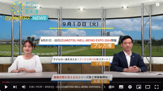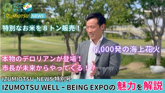 動画では、「IZUMIOTSU WELL-BEING EXPO 2024」を構成する「ファームテーブル」「ローカルエコロジー」「ヘルスイノベーション+防災」「コモンズアクション」「アートフルいずみおおつ」「ダイバーシティ教育」の6つのエリアとステージイベントの魅力を市長が紹介します。