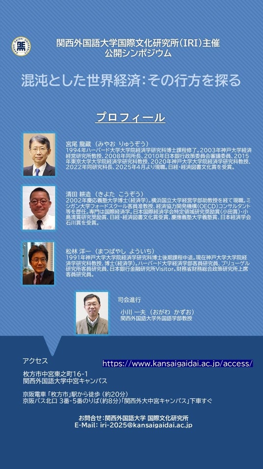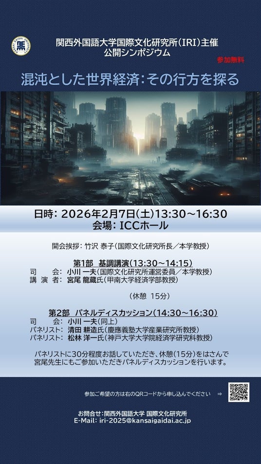 関西外国語大学 国際文化研究所(IRI)は、2026年2月7日(土)公開シンポジウム「混沌とした世界経済:その行方を探る」を開催します。