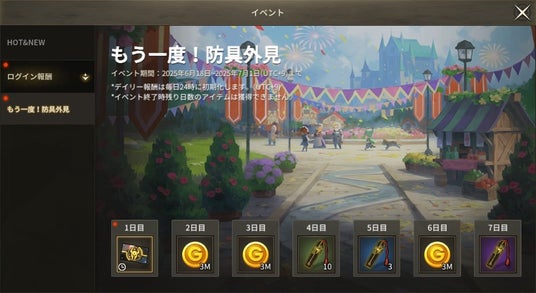 イベント期間中にゲームにログインすることで、「防具外見再合成券」1点、各等級の「ヘスティアの証」、合計900万ゴールドを獲得できます。