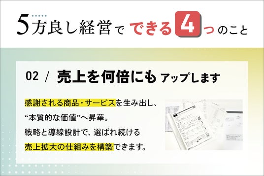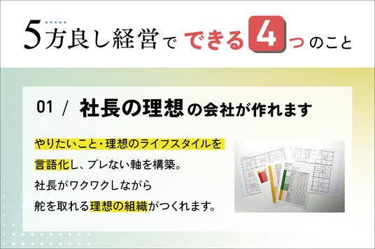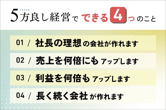 企業経営を5つの視点から整理する「5方良し経営」という考え方を提唱しています。