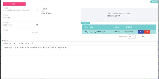 - 新規申請の作成、承認、否認、差戻し処理