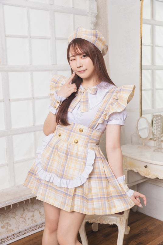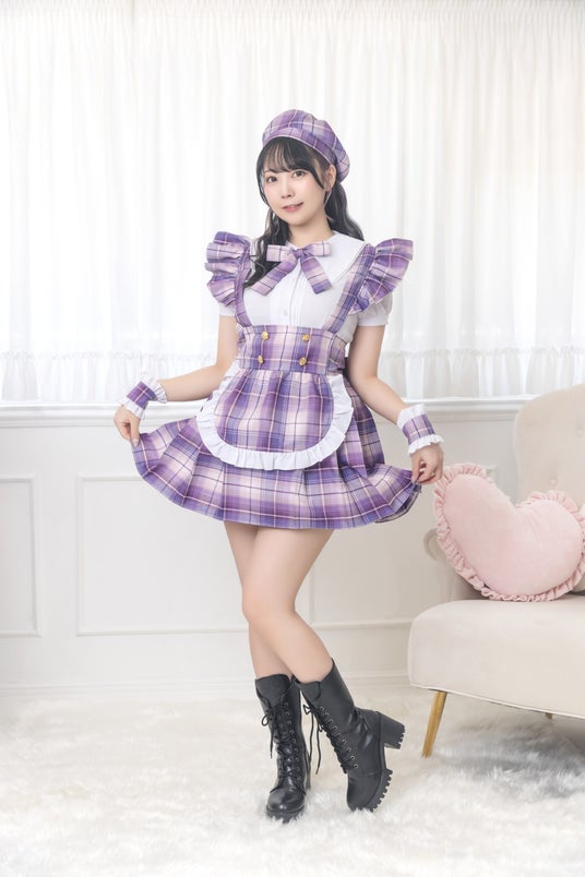 この商品は、アイドルのような爽やかなチェック柄とメイド服には珍しいベレー帽が特徴です。大好評のブルー、ピンク、イエローに続き、新色のミントとパープルがAmazon限定カラーとして追加されました。