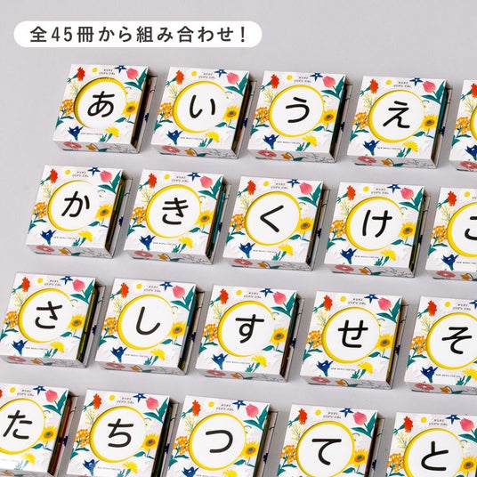 おなまえひらがなえほん(2~8文字選択可能)をラッピングしてお届けするギフトセットです。贈る相手のなまえにあわせて好きなひらがなを45音の中から自由にお選びいただけます。