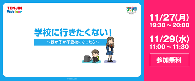 幼児・小学生・中学生を対象としたデジタル学習教材「天神」を企画・開発・販売する株式会社タオ(本社:滋賀県草津市、代表取締役:黒澤 慶昭)は、11月27日(月)の19:30、及び11月29日(水)11:00から「学校に行きたくない! ~我が子が不登校になったら~ 」と題してユーザー向けウェビナーを開催します。「天神」ユーザーは誰でも無料で参加でき、後日アーカイブも配信します。