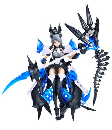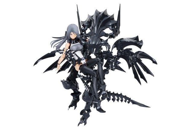 本作は「ダークな雰囲気」をテーマとしており、骨や魔物をイメージさせる各部の意匠や黒基調のカラーリングが、「可愛い」だけではない女の子プラキットの新たな可能性を切り拓きます。ドラセナはこれまでのブロッカーズFIOREと同様、花の名前が由来。素体だけでも可憐な姿をお楽しみいただく事ができるほか、ネビュラとの組み合わせでより謎めいた魅力を放ちます。タンポ印刷済み表情パーツは「通常顔」「笑い顔」「憂い顔」「怒り顔」の4種が付属。ネビュラは星雲の名を冠する漆黒の竜で、単体でも地球外生命体のような存在感を持ち、ドラセナに纏わせる事で鎧や武具になります。