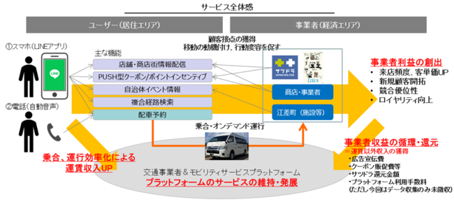 本実証実験は前回の試みをさらに進化させ、有償運行による住民の受容性の醸成や域内共通ポイントカード「江差EZOCA」やアプリによる購買や行動の需要喚起、オンデマンドバス(ジャンボハイヤー)による住民の移動促進を図ります。また地域の小売事業者など収入の増分を交通サービスの運営に充てる「収益循環モデル」の事業性検証を通して、同モデルの社会実装を目指すことを目的としています。