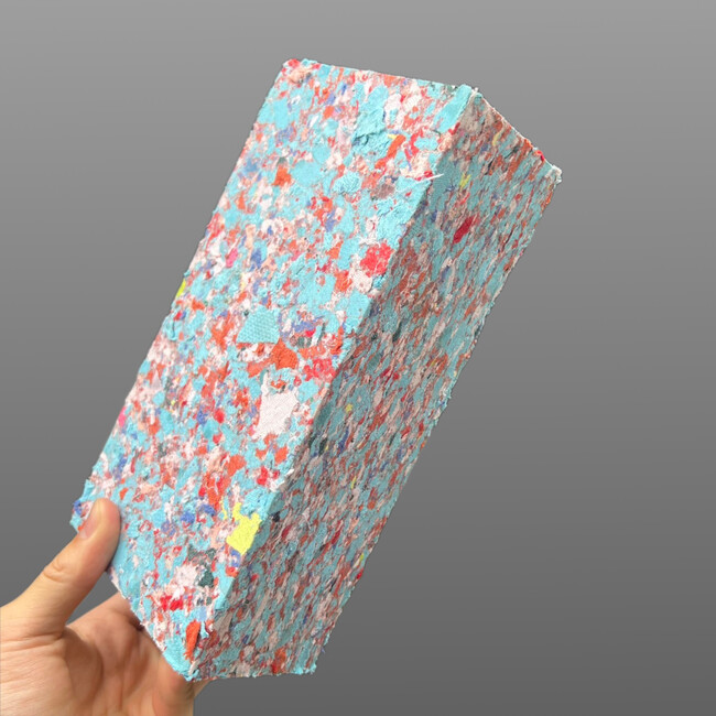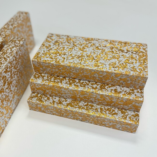 今までリサイクル困難であった箔押し紙(金紙-銀紙)をブロックに美しくリサイクル