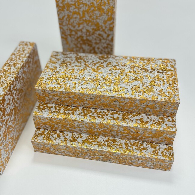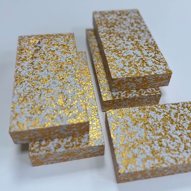 リサイクル困難な禁忌品の箔押し紙(金紙-銀紙)を美しくリサイクルしたブロックを、積んで、重ねて、並べて、貼って…、使い方は無限大。