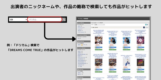 出演者のニックネームや作品タイトルの略称で検索した場合でもアイテムがヒットするように、「類義語」機能で同義語を登録し、検索精度を高めています。