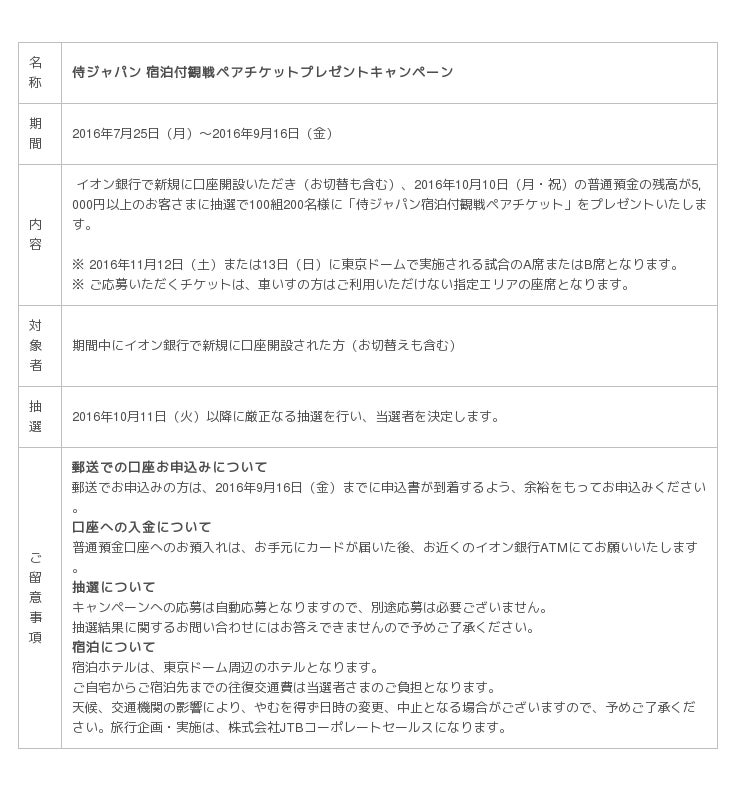 この度、株式会社イオン銀行(本社:東京都江東区、 代表取締役社長:渡邉 廣之、 以下 「イオン銀行」)は、「侍ジャパン」のオフィシャルパートナーとなりました。これを記念し、イオン銀行で新規に口座を開設された方の中から抽選で100組200名さまに侍ジャパン宿泊付観戦ペアチケットプレゼントいたします。