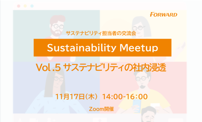 企業のブランド戦略を支援する株式会社フォワード(本社:東京都中央区、代表取締役:伊佐 陽介)は、「Sustainability Meetup Vol.5サステナビリティの社内浸透~社員の自分ごと化」を2022年11月17日(木)にオンラインにて開催致します。これまで月1回開催してきましたが、早くも5回目の開催となりました。今回は「サステナビリティの社内浸透」について情報交換をしていただければと思います。(詳細・お申込みはこちらから:https://www.forward-inc.co.jp/seminar/2022/11/17)