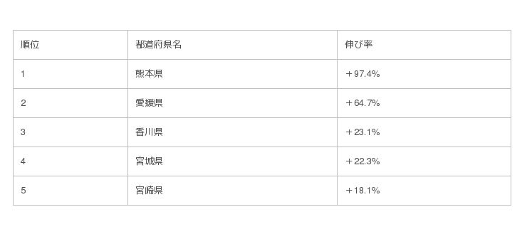 5位の宮崎県では、2017年12月、初のLCC国際線としてイースター航空が宮崎−ソウル線に就航したことなどから特に韓国在住者の予約が順調に伸び、+18.1%(約1.2倍)となりました。