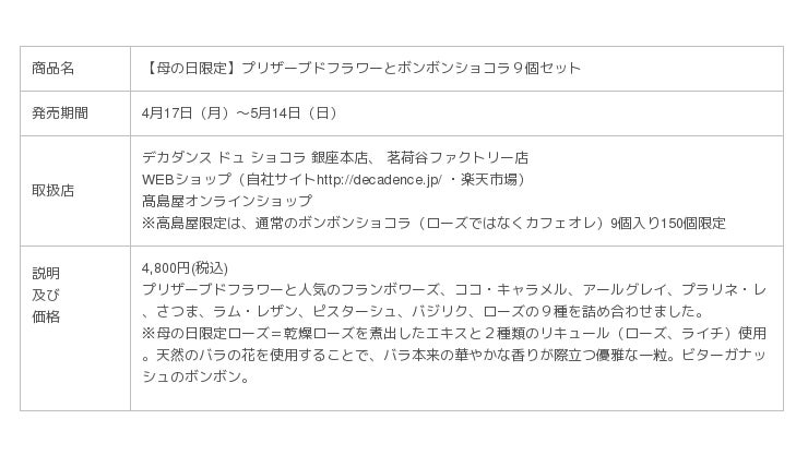 4月17日(月)から、ショコラトリー デカダンス ドュ ショコラにて「母の日限定 プリザーブドフラワーとボンボンショコラ9個セット」を販売致します。
